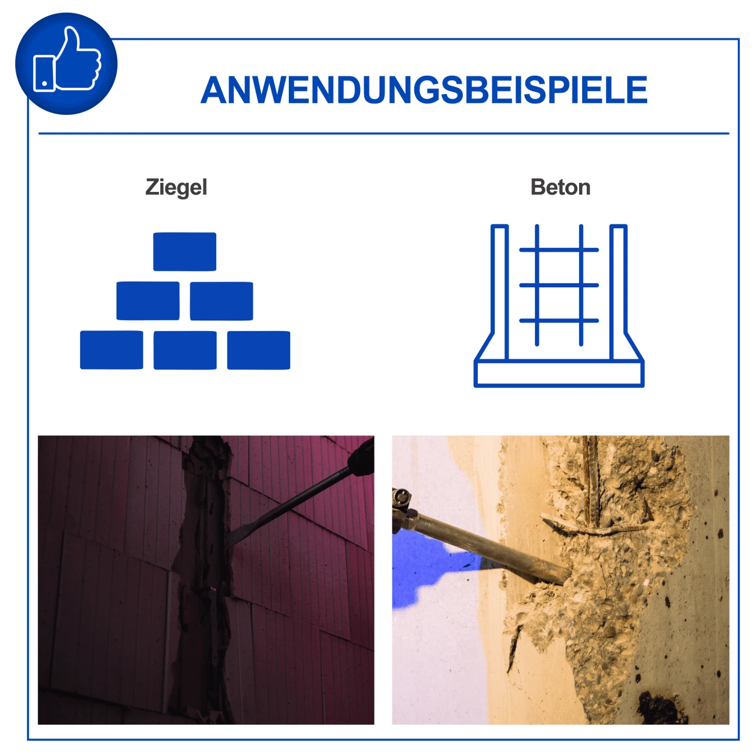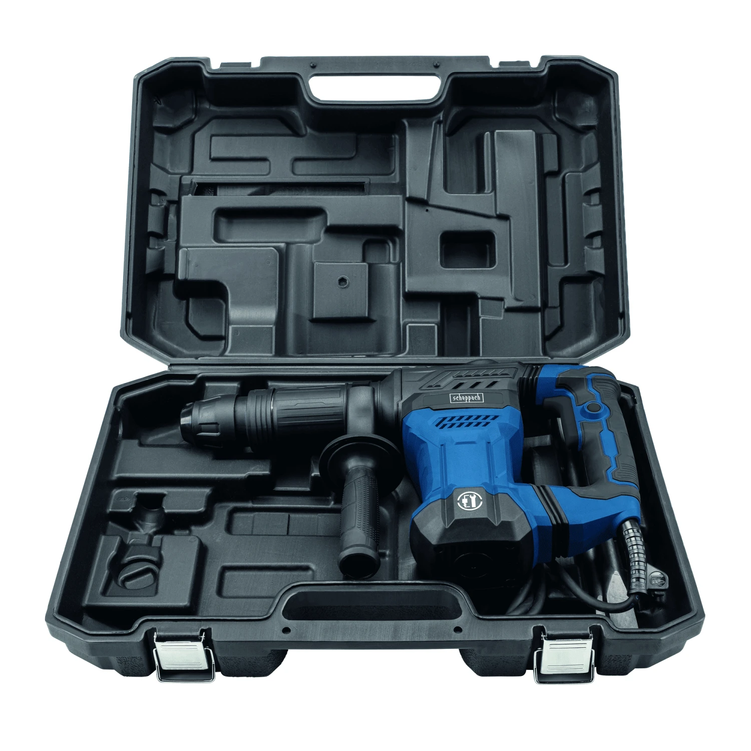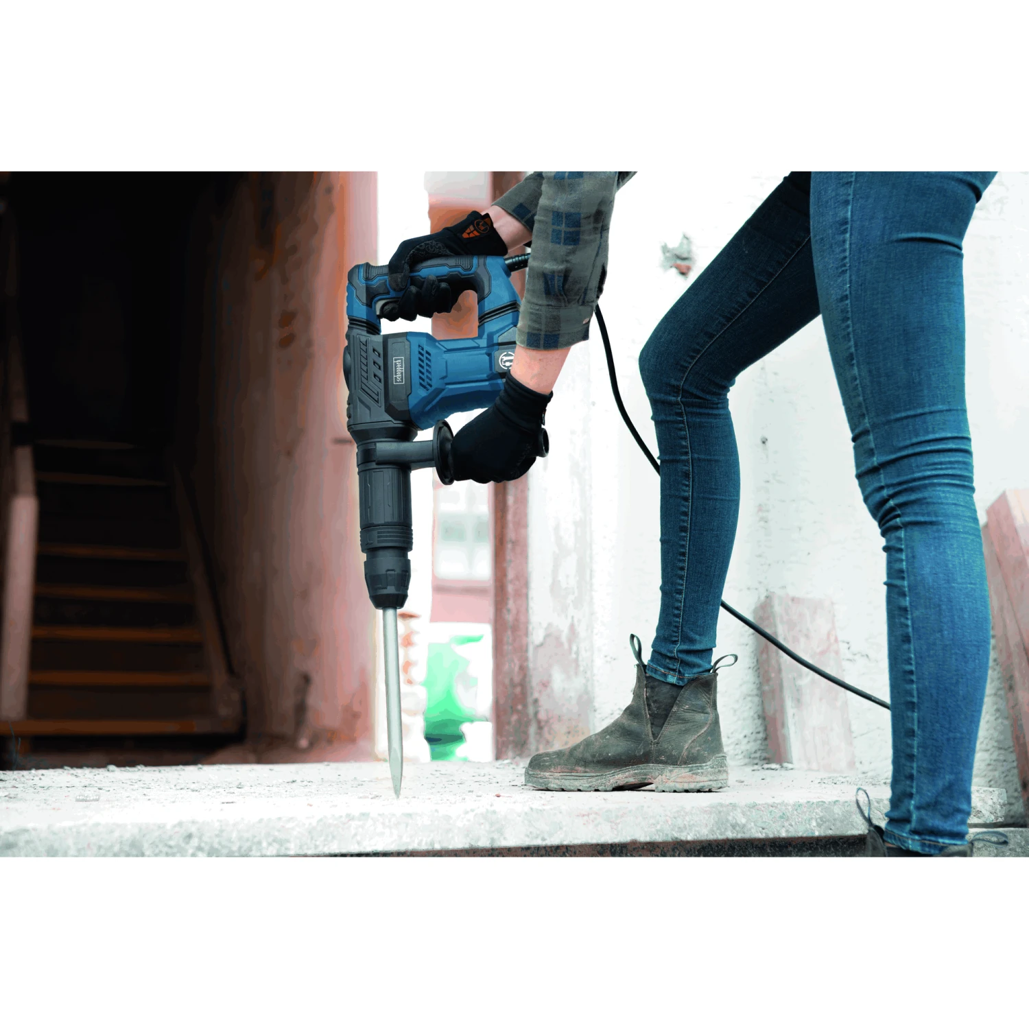 Der Abbruchhammer AB1500X von Scheppach ist optimal für schwere Abbruch- und Meiselarbeiten geeignet. Mit seinem 1300 Watt Elektromotor, 20 Joule Schlagkraft und 4100 Schlägen pro Minute ist er ein echtes Kraftpaket. Dank Anti-Vibration und der beiden Handgriffe mit Soft-Grip, liegt das Gerät während der Arbeit sicher in der Hand. Der AB1500X wird inklusive Spitz- und Flachmeißel geliefert.