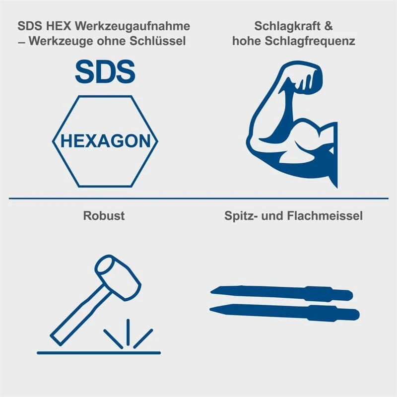 - Inklusive Spitz- und Flachmeißel und Metallkoffer