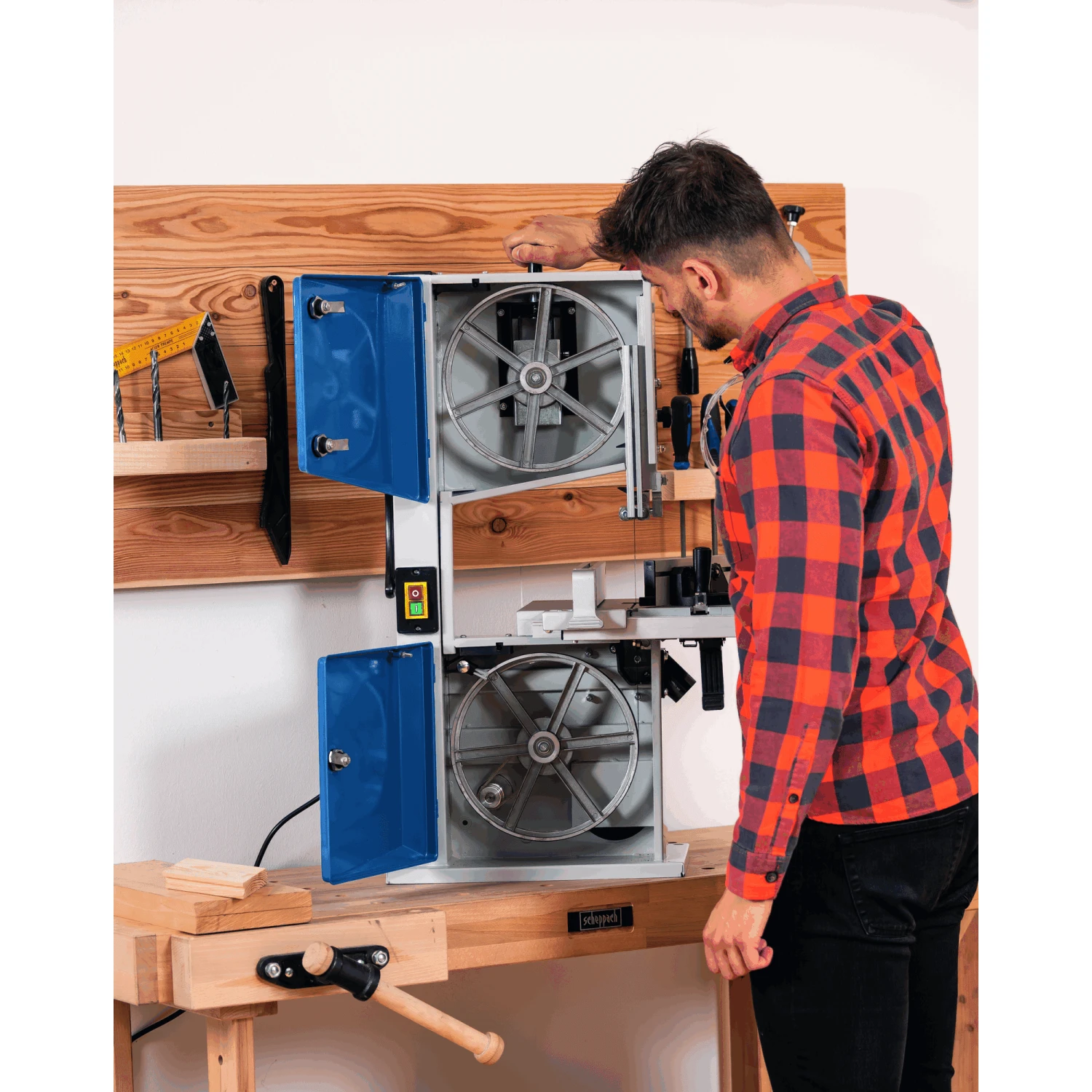 Lieferumfang: 1 x Bandsäge (Maschinengestell), 1 x Sägetisch, 1 x Halteplatte, 1 x Schiene mit Skala, 1 x Schiebestock, 1 x Längsanschlag, 3 x Inbusschlüssel, 1 x Schraubendreher, 2 x Gabelschlüssel, 1 x Tischverbreiterung mit Führungsschiene für Längsanschlag, 1 x Bef