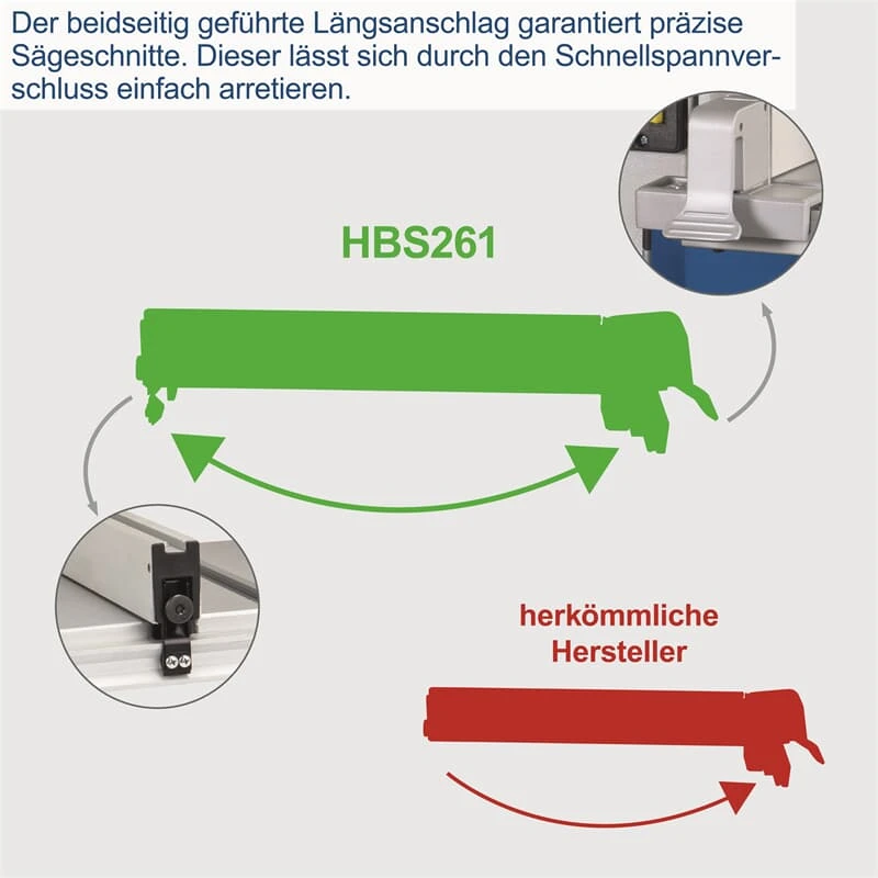 Der beidseitig geführte Längsanschlag garantiert präzise Sägeschnitte. Dieser lässt sich durch den Schnellspannverschluss einfach arretieren.