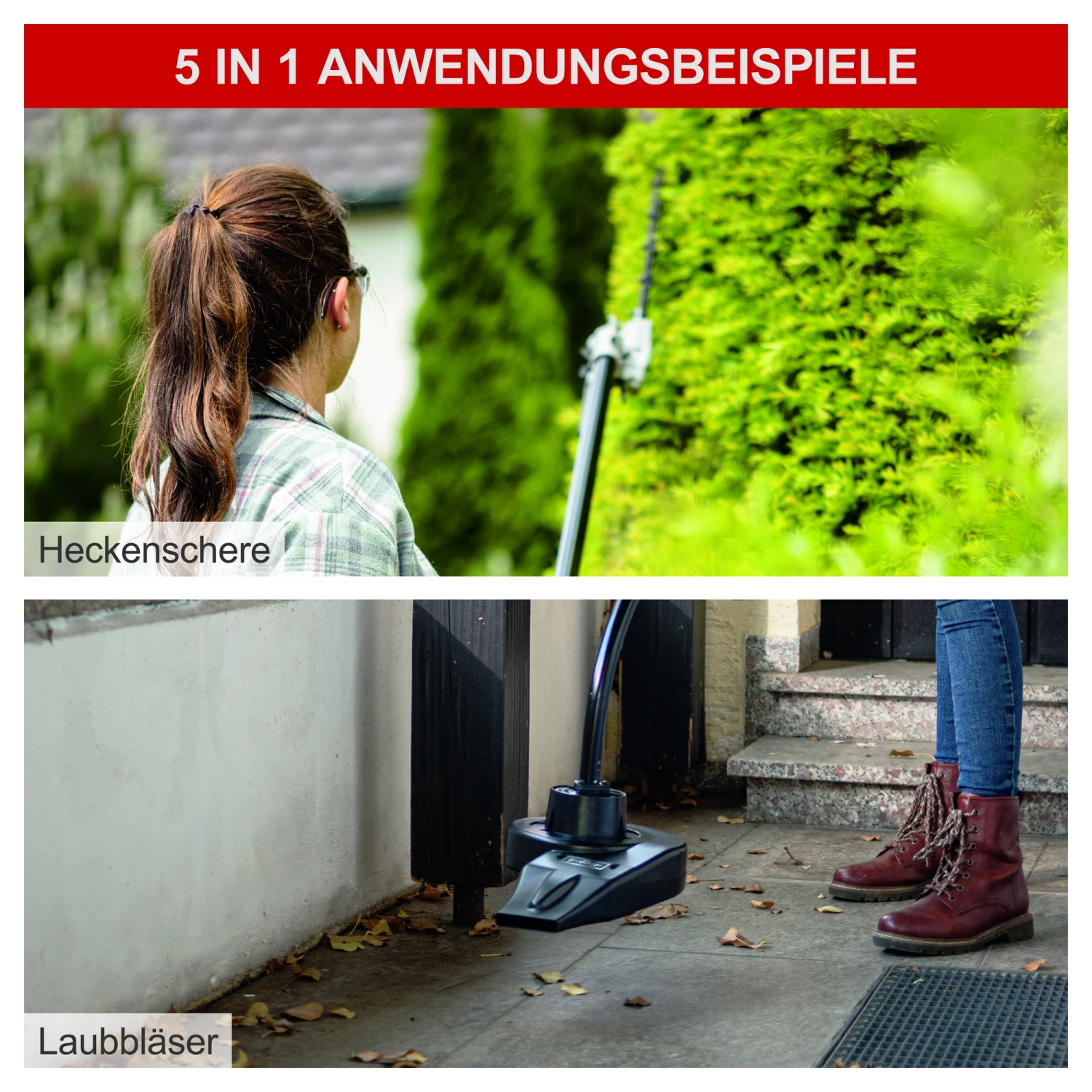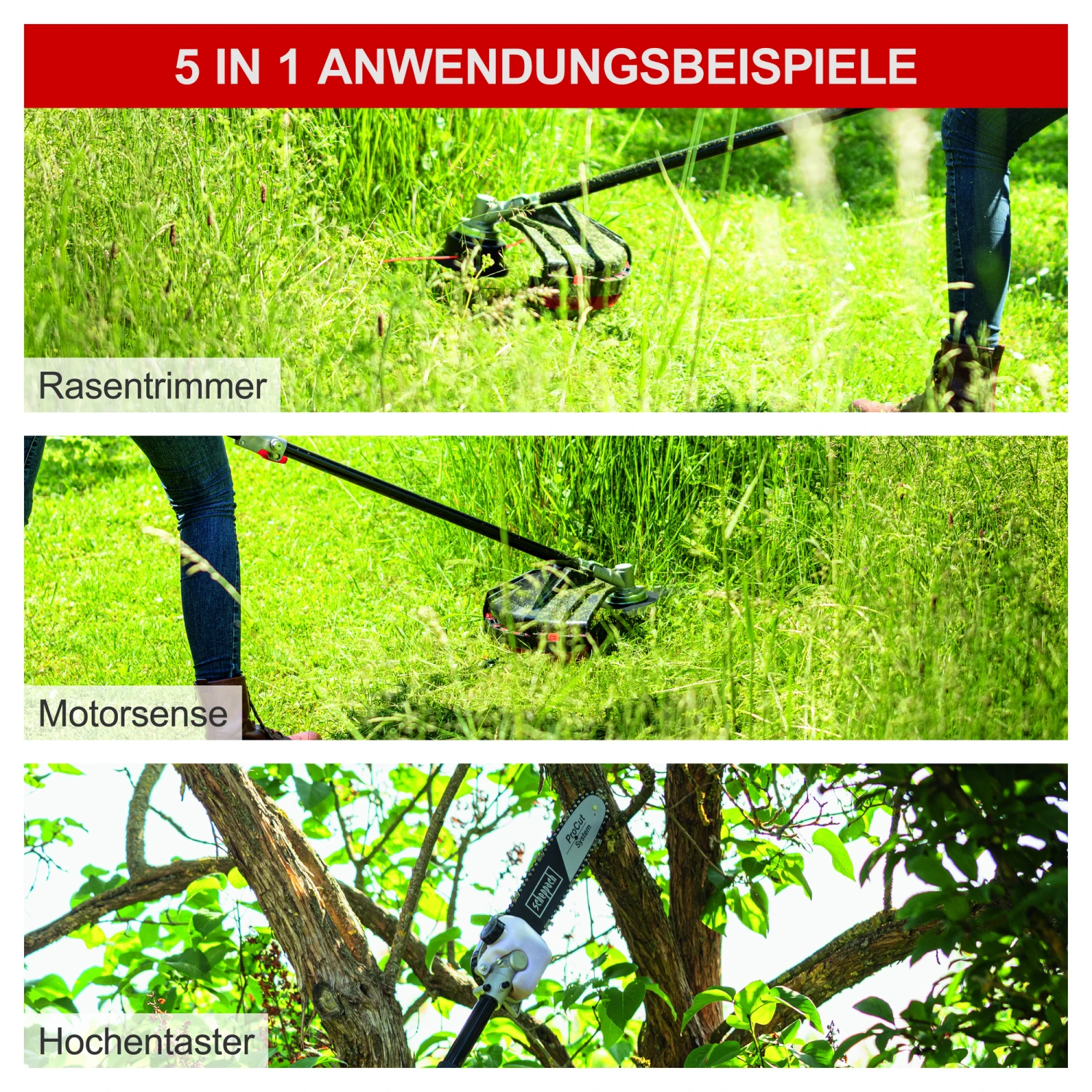 Lieferumfang: 1 x Motor-Antriebseinheit, 1 x Hochentaster, 1 x Heckenschere, 1 x Motorsense, 1 x Rasentrimmer, 1 x Zündkerzenschlüssel, 1 x Gabelschlüssel, 1 x Inbusschlüssel Gr. 4, 1 x Inbusschlüssel Gr. 5, 3 x Kabelbinder, 1 x Öl- Benzinmischflasche, 1 x Tragegurt (2