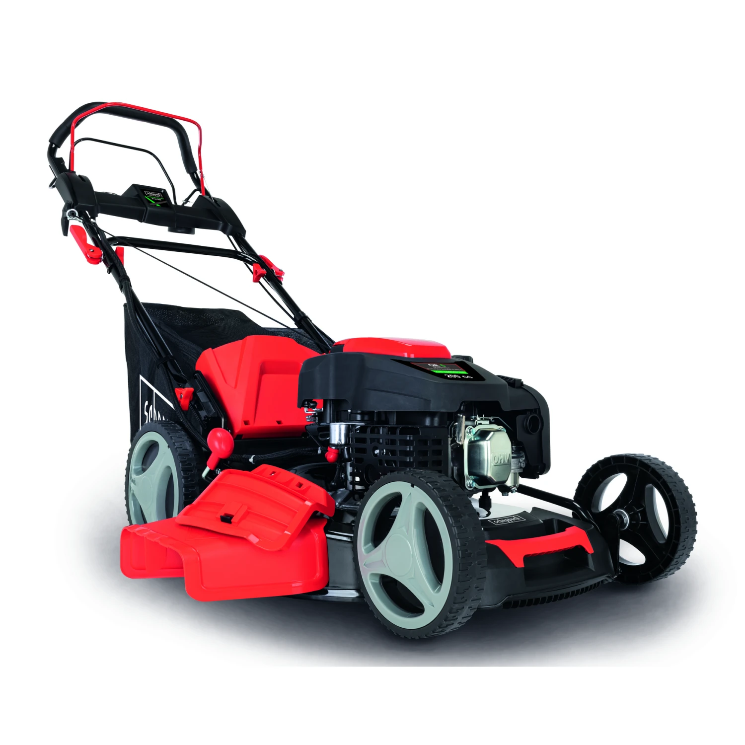 Lieferumfang: 1 x Benzin-Rasenmäher, 2 x Rundkopfschraube M8, 2 x Beilagscheibe klein, 2 x Beilagscheibe groß, 4 x Kunststoffsternmutter, 1 x Kabelclip, 4 x Schraube, 4 x Klettband, 1 x Bedienungsanleitung, 2 x Kunststoffscheibe, 2 x Plastikhalter, 1 x Mulcheinsatz, 1