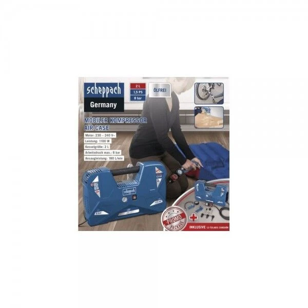 DER MOBILE KOMPRESSOR VON SCHEPPACH IST EIN PRAKTISCHES WERKZEUG FÜR JEDEN PRIVATANWENDER UND KLEINE WERKSTÄTTEN UND KANN EINFACH ZUM EINSATZORT TRANSPORTIERT WERDEN. DAS UMFANGREICHE ENTHALTENE ZUBEHÖR-SET UND SEINE MAX. 8 BAR DRUCKLEISTUNG ERMÖGLICHEN EINE VIELZAHL VON ANWENDUNGEN.