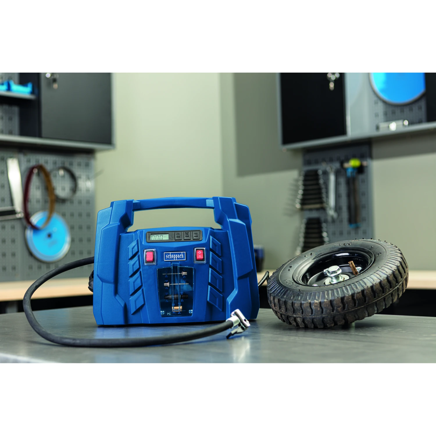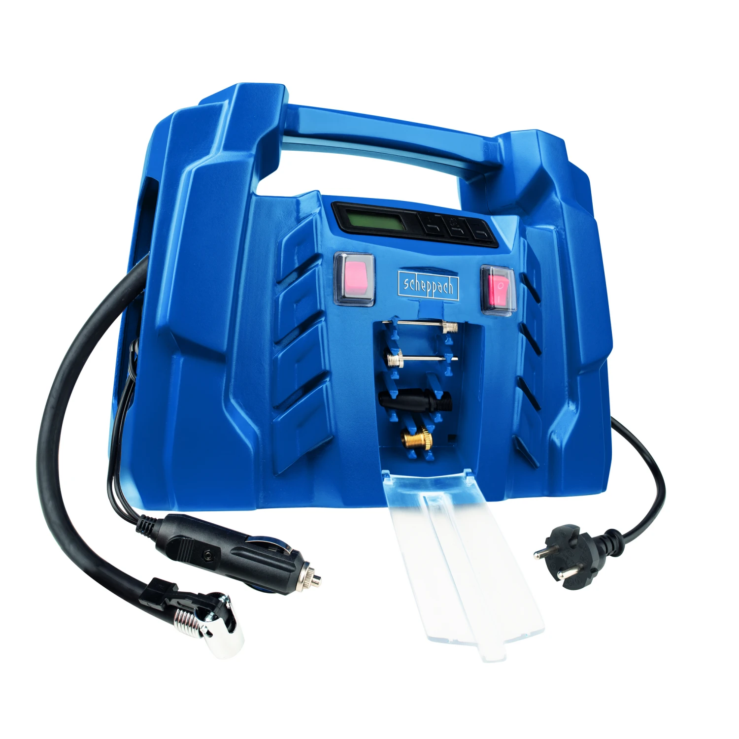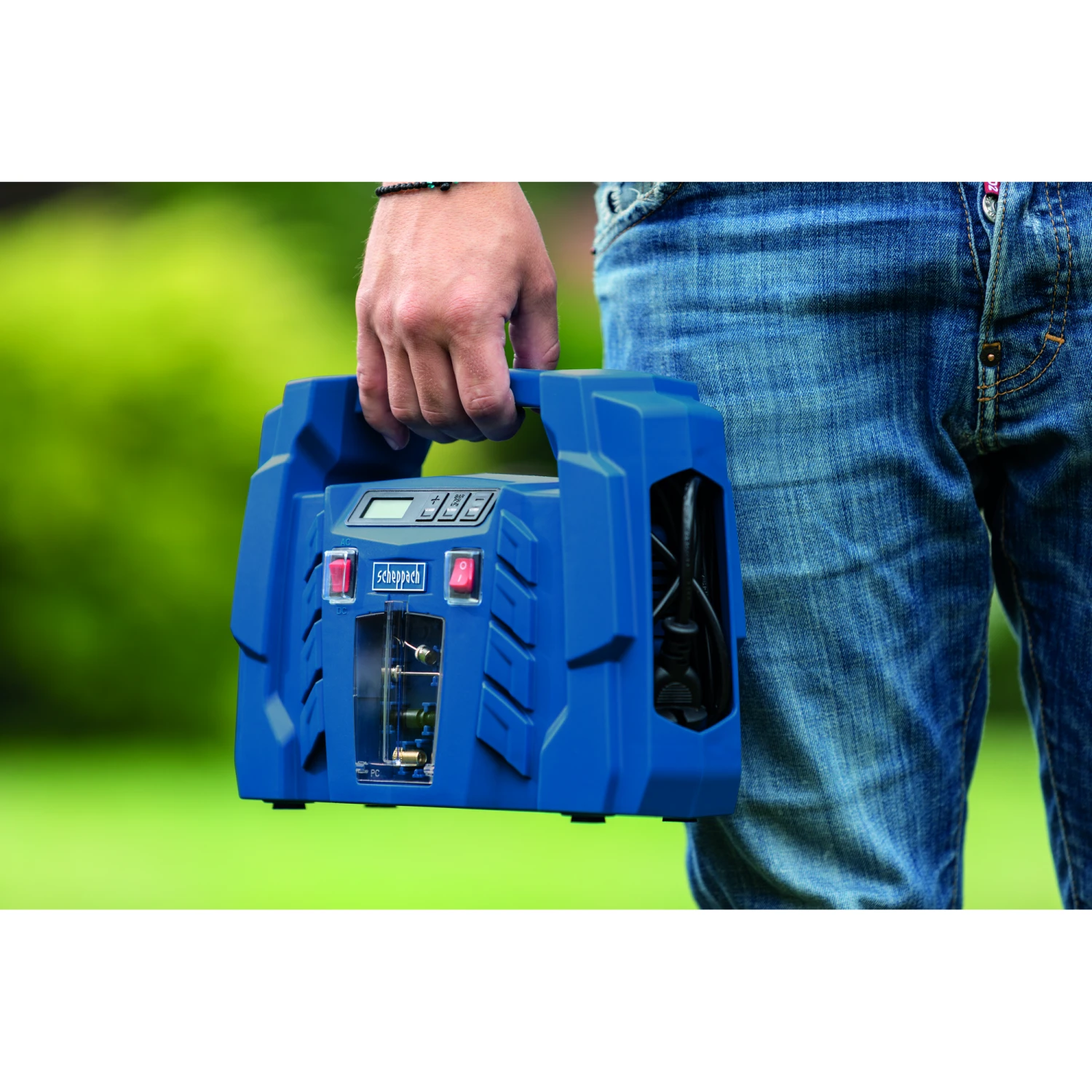 Druckluft für unterwegs, mit dem ‚Air Force 5‘ von scheppach. Der handliche Kompressor im Kofferformat kann sowohl an eine 230 V Steckdose als auch an die 12 V Steckdose eines Autos angeschlossen werden. Ein digitales Manometer zeigt den aktuellen Druck des aufgepumpten Gegenstandes und ermöglicht die Voreinstellung des gewünschten Druckes von 0,1 bis 8 bar. Sobald dieser Druck erreicht ist, schaltet der Kompressor automatisch ab. Das gesamte Zubehör ist komfortabel an den Seiten des Geräts bzw. in einem Frontfach verstaubar.