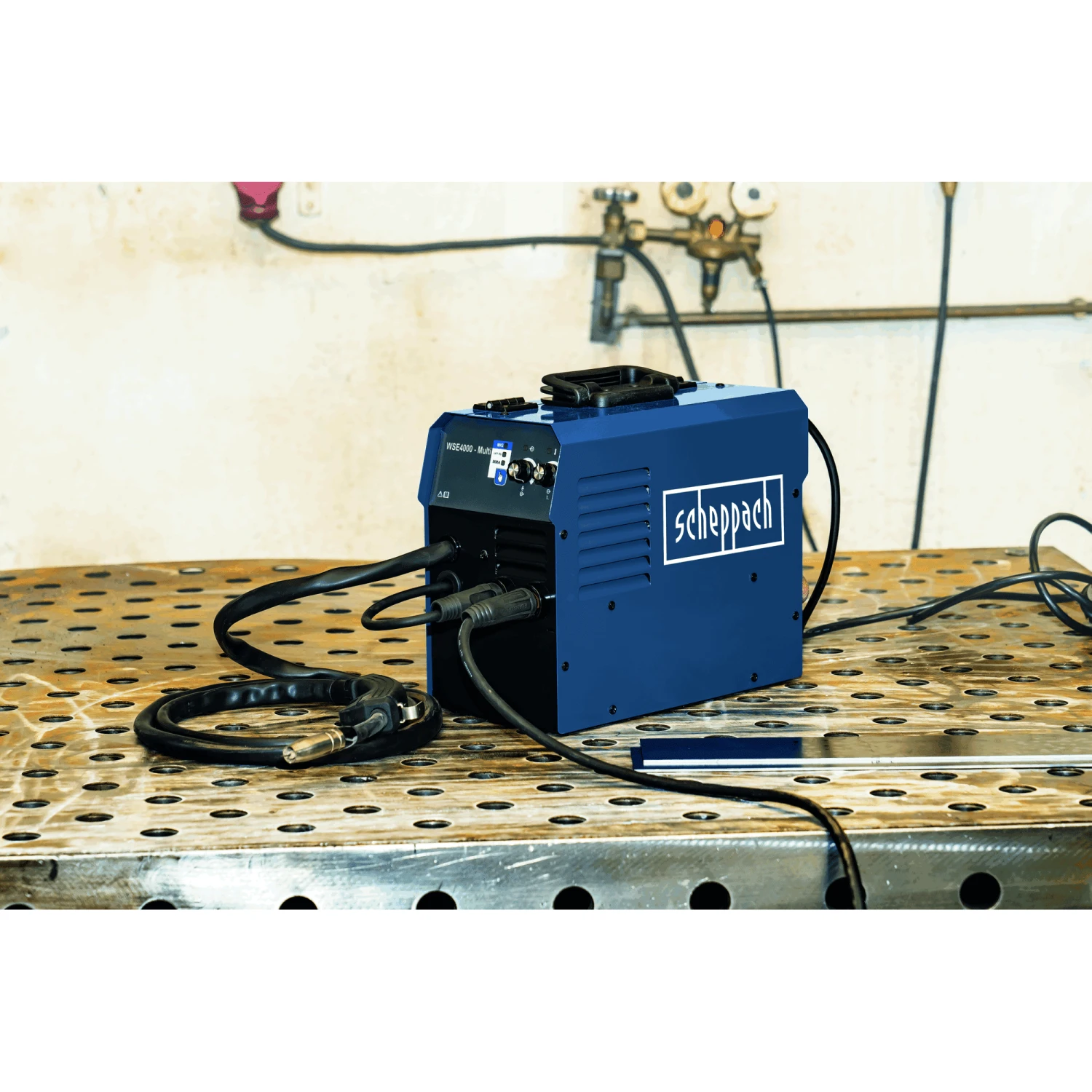 Das ‚WSE4000-Multi‘ vereint alle gängigen Schweißverfahren in einem handlichen Gerät: WIG(TIG), MIG/MAG, MMA und Fülldrahtschweißen sind damit problemlos möglich. Eine stufenlos einstellbare Stromstärke mit Spitzenwerten von 120 A, ein Druckregler zur optimalen Einstellung des Schutzgases und die beiden Schweißdüsen mit 0,6 und 0,8 mm machen das Scheppach WSE4000-Multi zu einem vielseitig einsetzbaren Schweißgerät. Dank verschiedener Schweißverfahren gelingen sichere und dauerhafte Verbindungen bei Materialstärken bis zu 5 mm und bei verschiedensten Materialien wie Aluminium, Stahl oder Edelstahl.