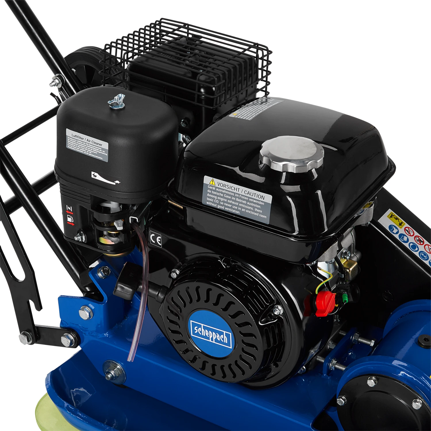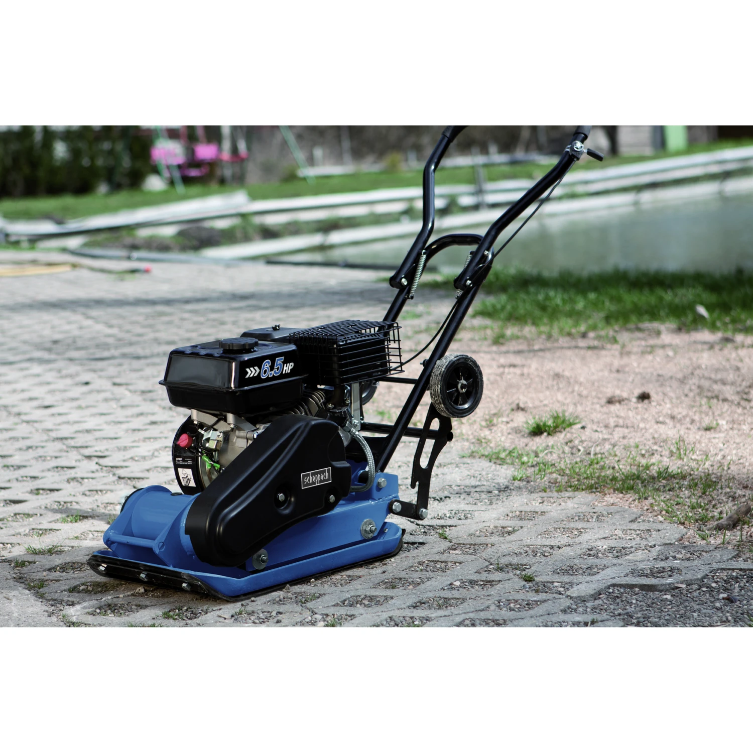 Die leistungsstarke Rüttelplatte der Marke Scheppach dient zur Bodenverdichtung mittelgroßer Flächen, indem diese mit einer Kraft von bis zu 13.000 N gepresst werden. Das Gerät erreicht eine überdurchschnittlich hohe Arbeitsleistung und kann mithilfe der Fahrvorrichtung einfach transportiert werden. Im Lieferumfang befindet sich eine transparente Gummimatte, um auch Pflastersteine zu bearbeiten.