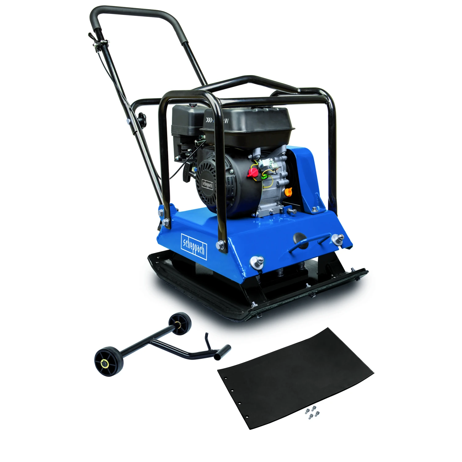 Lieferumfang: Rüttelplatte, Fahrvorrichtung, Gummimatte