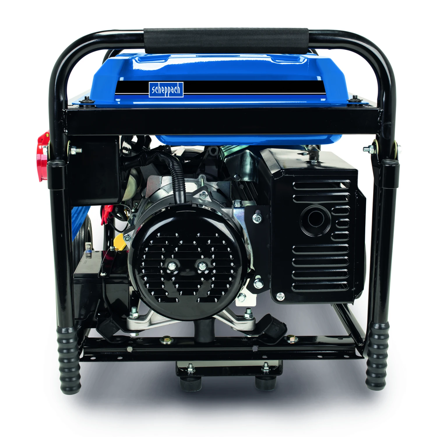 Der Stromgenerator ‚SG7100‘ von Scheppach wird mit einem 420 cm³ 4-Takt-Motor angetrieben und liefert mit maximal 5500 W ausreichend Strom für Arbeiten rund ums Haus oder auf der Baustelle. Ein 25 l Benzintank sorgt für eine etwa 10-stündige Stromversorgung des leistungsstarken Benzinmotors. Der integrierte Überlastungsschutz, ein Spannungsmesser und die Ölstandswarnung sorgen für einen sicheren Betrieb. Mit dem stabilen Stahlrahmen, der Fahrvorrichtung und den ausklappbaren Handgriffen ist der Stromerzeuger mobil und vielseitig einsetzbar.