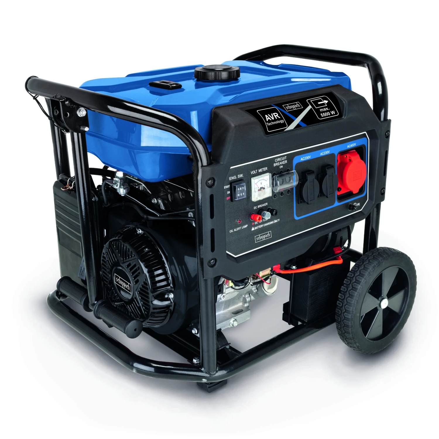 Der Stromgenerator ‚SG7100x‘ von Scheppach mit 12,2 PS Benzinmotor mit Elektrostart oder alternativem Seilzugstarter. Leistungsstarker und luftgekühlter 4-Takt-Benzinmotor mit 420 cm³ Hubraum. Maximal 5500 W Ausgabeleistung, 5000 W Nennleistung bei 400 V~. Ausgestattet mit einem 400 V~ Anschluss, zwei 230 V~ Anschluss und ein 12 V DC Konnektor für maximale Flexibilität. Stabiler und robuster Stahlrahmen mit Fahrvorrichtung und ausklappbaren Handgriffen. Der 25 Liter Benzintank reicht für einen stundenlangen Einsatz des Generators. Integrierter Überlastungsschutz, Spannungsmesser und Ölstandswarnung.