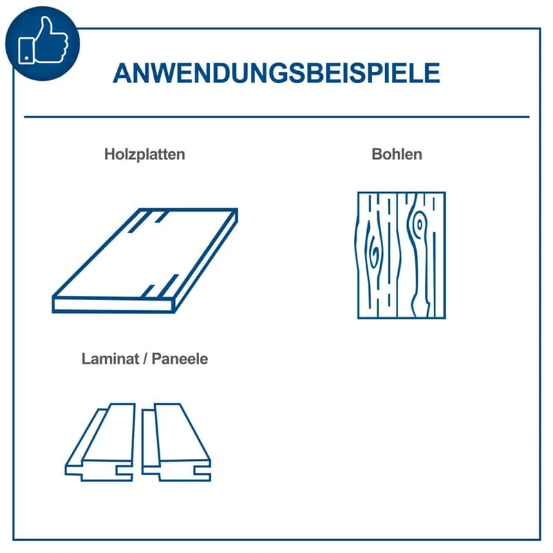 - Geeignet für unterschiedliche Materialien wie Massivholz, Arbeitsplatten, beidseitig beschichtete MDF-Platten, Laminat etc.
