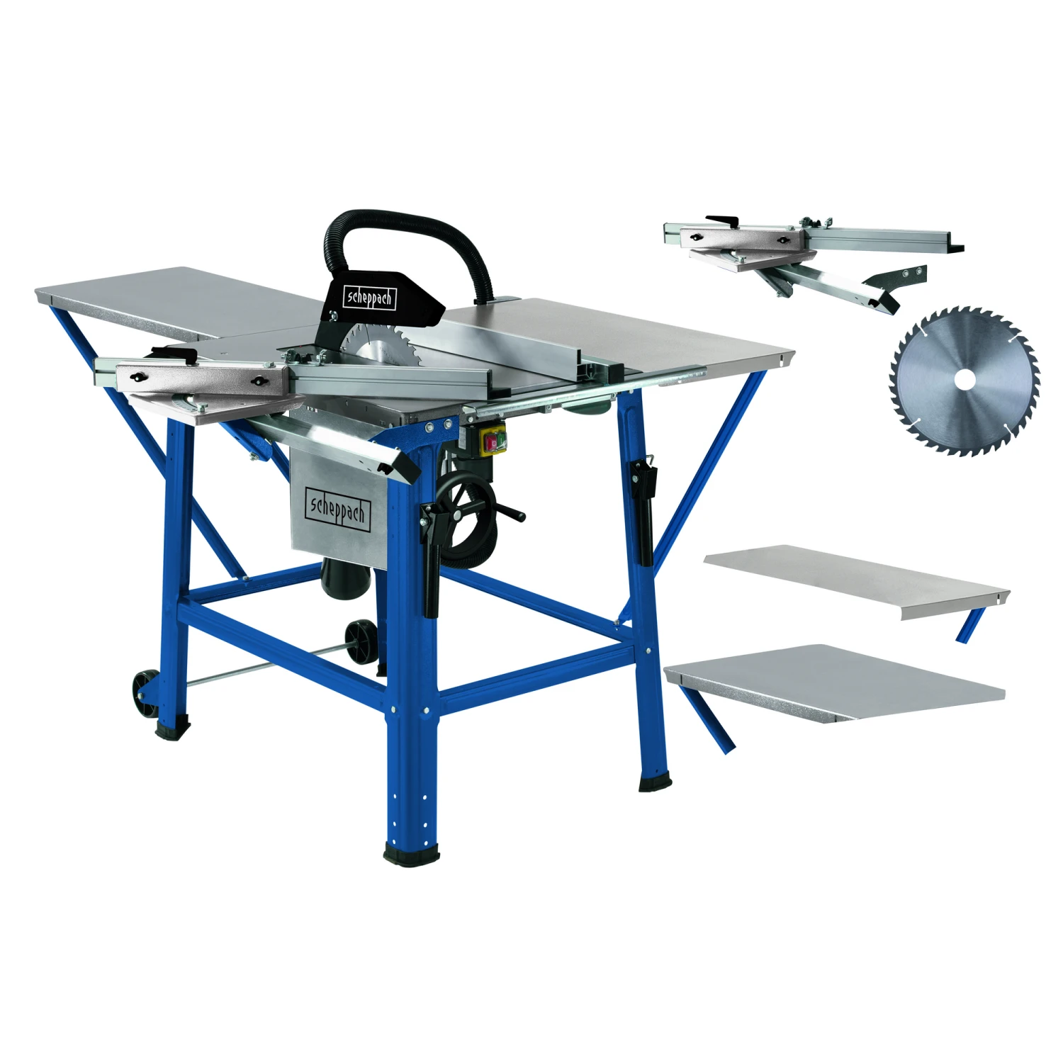 Tischkreissäge ‚TS310‘ von Scheppach mit einem leistungsstarken 2800 W (230 V~, 2200 W) Induktions-Motor. Serienmäßiger Schiebeschlitten mit Anschlagschiene. Stabiles, pulverbeschichtetes Stahl-Untergestell mit verzinktem Arbeitstisch. Tischverlängerung und Tischverbreiterung serienmäßig. Sägeblattschutz mit Absaugschlauch. Bequeme Schnitthöheneinstellung mittels großem Handrad. Maximal 83 mm Schnitttiefe. Zwei langlebige Ø 315 mm HW-Sägeblätter für gleichbleibende und präzise Schnittergebnisse. Sägeblattschutz für maximale Arbeitssicherheit. Stabile Parallel-Anschlagschiene. Bequemer Transport durch abklappbare Handgriffe und stabile Fahrvorrichtung.
